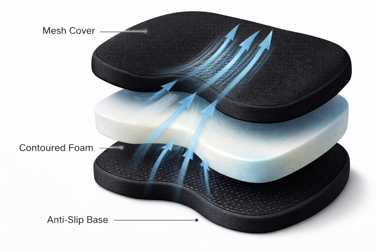 A good cushion reduces peak pressure under the ischial tuberosities (“sit bones”) and, when needed, unloads the coccyx. The direct answer: look for contoured designs and evidence of pressure reduction, not just “plushness.”